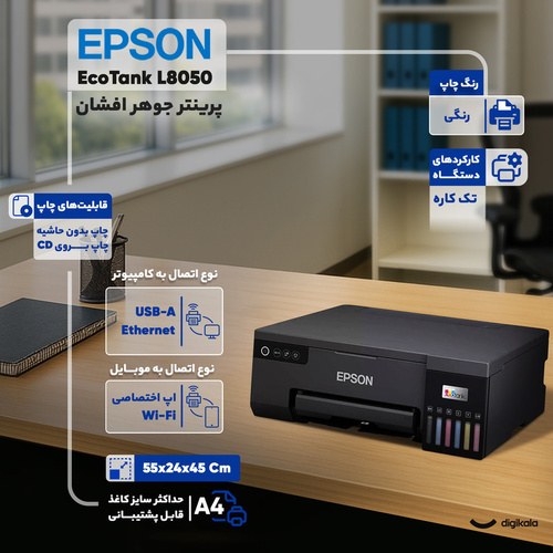 پرینتر جوهرافشان اپسون L8050 از سری پرینترهای تککاره تولیدشده توسط برند مطرح EPSON است که برای چاپ تصاویر و عکسها بهصورت رنگی و باکیفیت بالا مورداستفاده قرار میگیرد. این پرینتر از 6 مخزن جوهر جداگانه مشکی و رنگی در عملیات چاپ استفاده میکند و به دلیل داشتن نازل های فراوان جهت پاشش جوهر بر روی صفحه کاغذ، از کیفیت چاپ بسیار بالایی بهره میبرد. پرینتر اپسون L8050 بهمنظور استفادههای خانگی و تجاری تولیدشده است.